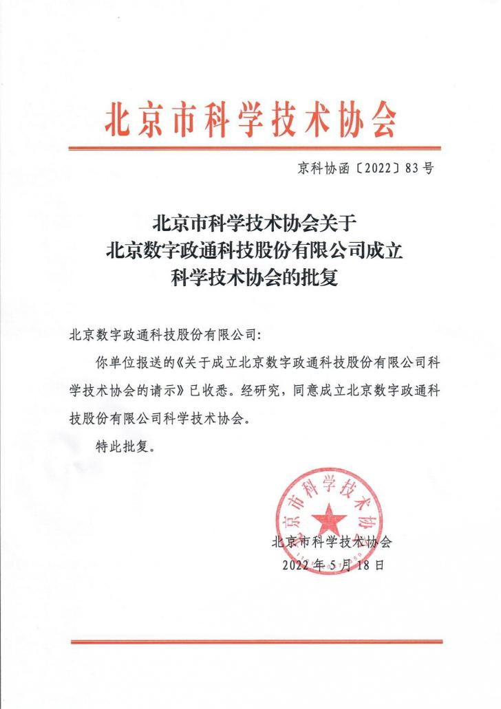 近日,北京市科學技術(shù)協(xié)會印發(fā)了《關(guān)于北京數(shù)字政通科技股份有限公司成立科學技術(shù)協(xié)會的批復(fù)》(京科協(xié)函【2022...