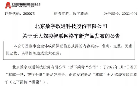 1月7日,北京數(shù)字政通科技股份有限公司(證券代碼:300075)發(fā)布《關(guān)于無人駕駛智聯(lián)網(wǎng)格車新產(chǎn)品發(fā)布的公告》,正式發(fā)...