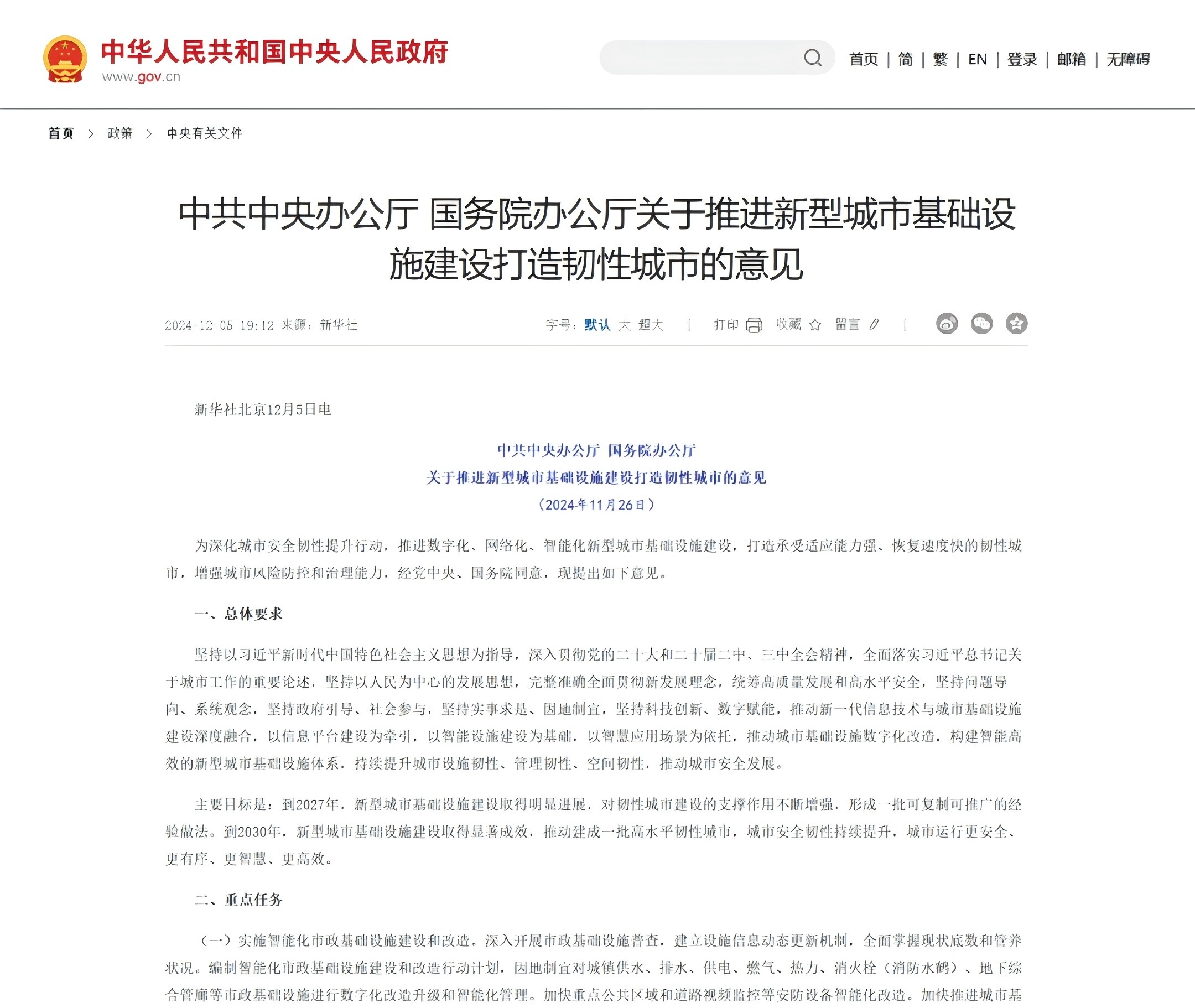 2024年12月5日,中共中央辦公廳、國務院辦公廳發(fā)布了《關(guān)于推進新型城市基礎(chǔ)設(shè)施建設(shè)打造韌性城市的意見》,明...